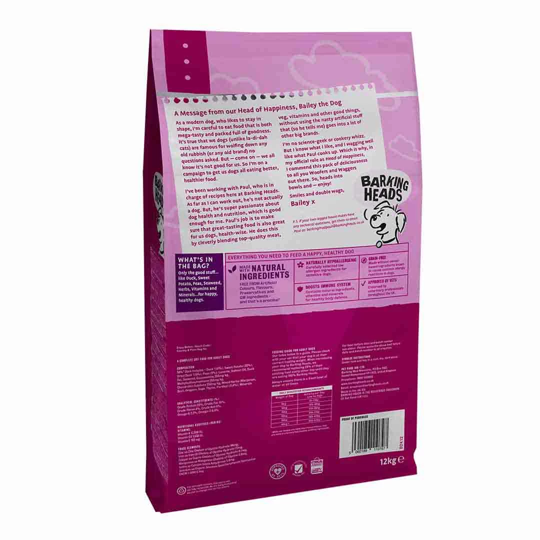 Duck (41%), Sweet Potato (32%), Dried Duck (15%), Peas (9%), Lucerne, Salmon Oil, Duck Fat, Seaweed, Glucosamine, Methylsulfonylmethane, Chondroitin Sulphate, Mixed Herbs (Marjoram, Basil, Oregano, Sage, Thyme, Parsley) (0.4%), Minerals