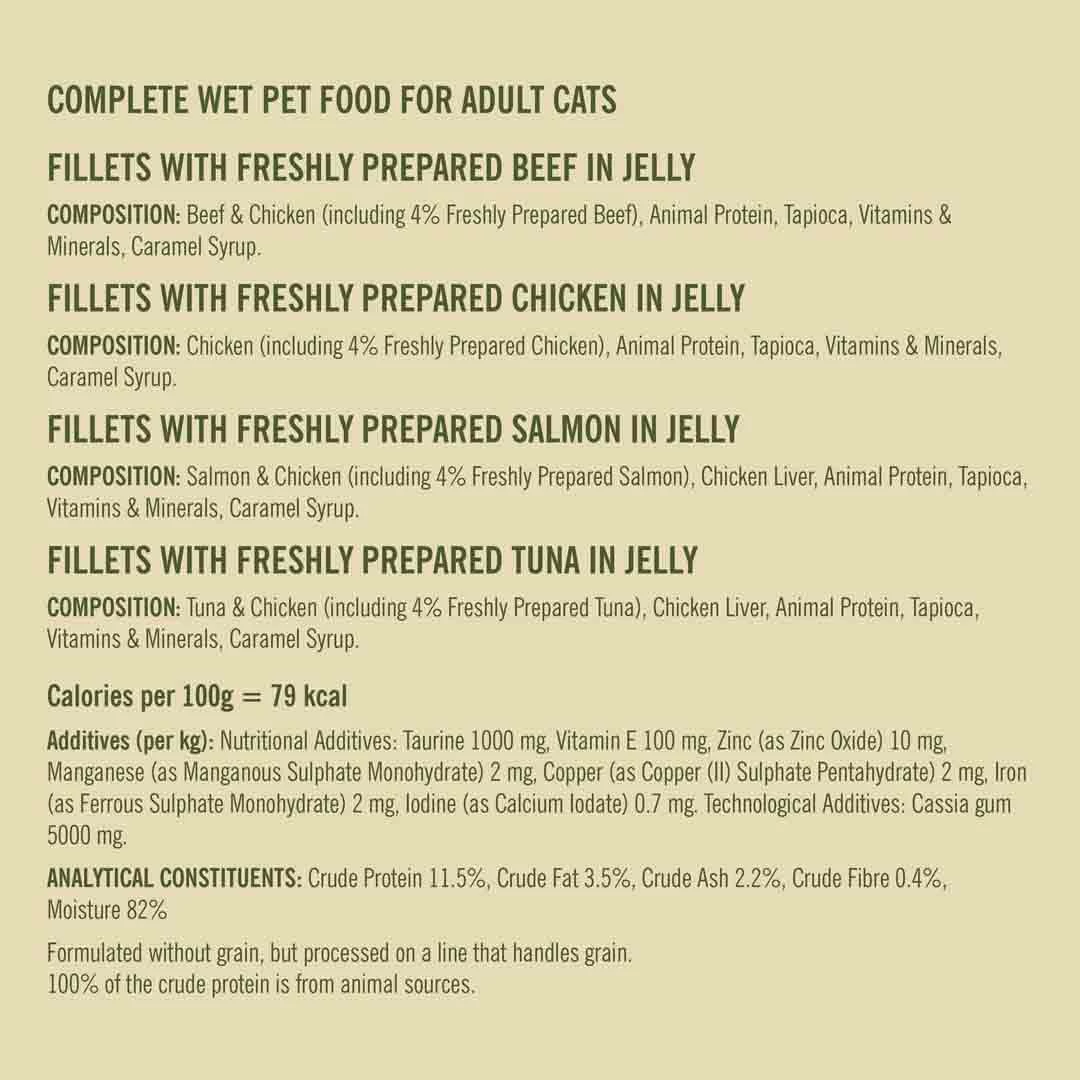 Beef & Chicken (including Freshly Prepared Beef) (4%), Animal Protein, Tapioca, Vitamins & Minerals, Caramel Syrup, Chicken (including Freshly Prepared Chicken) (4%), Animal Protein, Tapioca, Vitamins & Minerals, Caramel Syrup, Salmon & Chicken (including Freshly Prepared Salmon) (4%), Chicken Liver, Animal Protein, Tapioca, Vitamins & Minerals, Caramel Syrup, Tuna & Chicken (including Freshly Prepared Tuna) (4%), Chicken Liver, Animal Protein, Tapioca, Vitamins & Minerals, Caramel Syrup