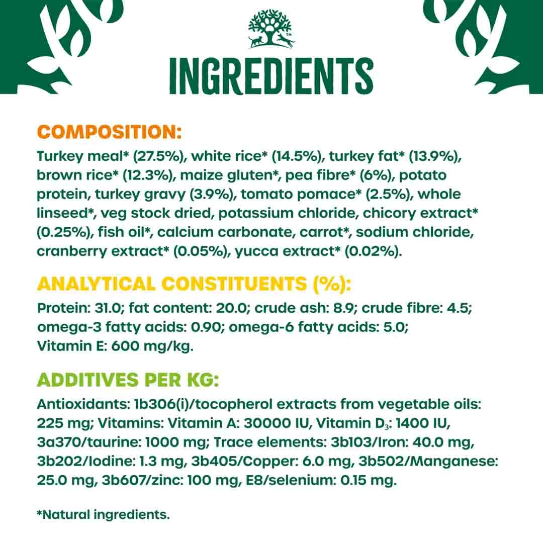 Turkey meal (27.5%), white rice, turkey fat, brown rice, maize gluten, pea fibre (6%), poultry gravy, potato protein, tomato pomace (2.5%), whole linseed (2.5%), potassium chloride, chicory extract (0.25%), omega oil supplement, calcium carbonate, carrot, sodium chloride, cranberry extract (0.05%), yucca extract (0.02%)