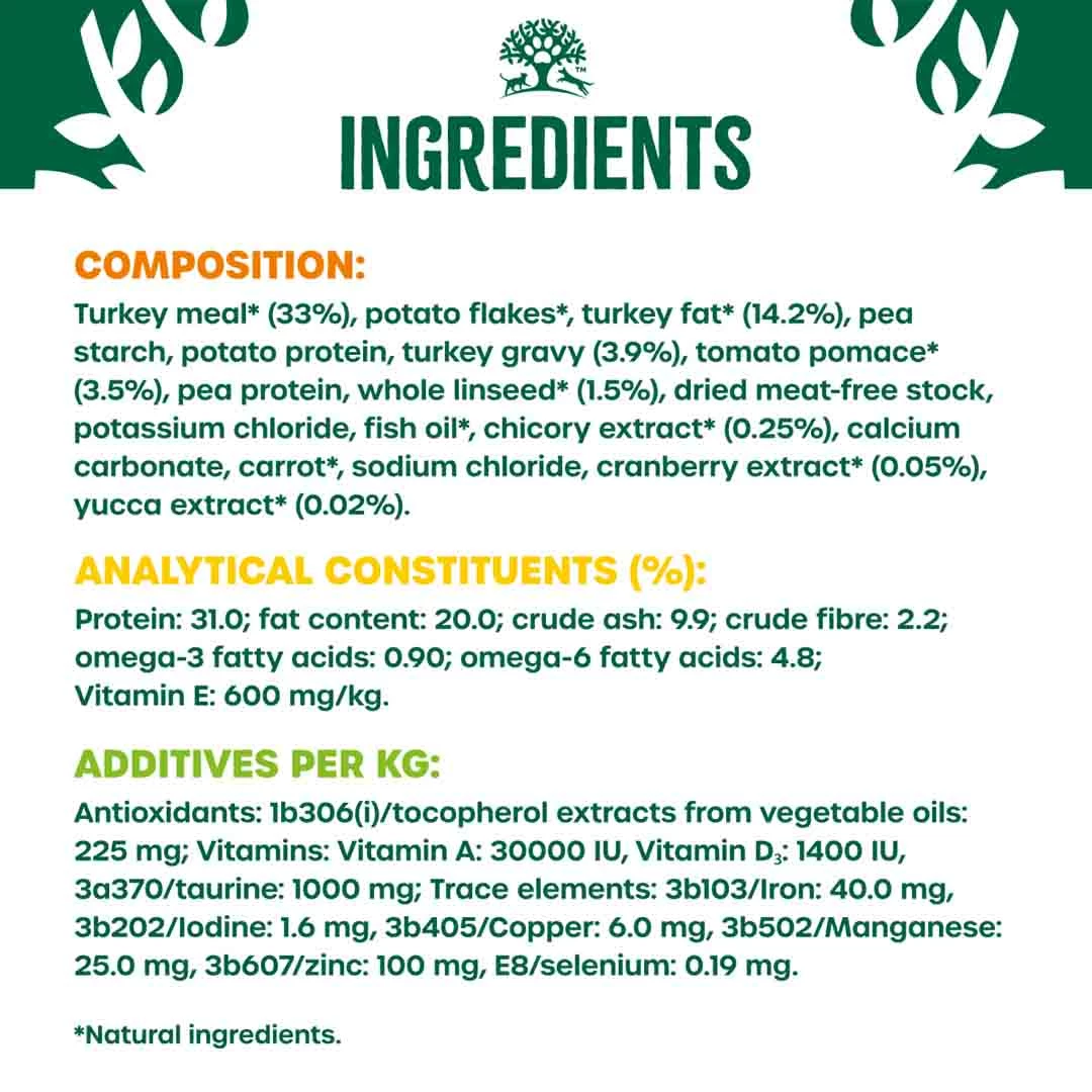 Turkey meal (33%), potato flakes, turkey fat (14.2%), pea starch, potato protein, turkey gravy (3.9%), tomato pomace, pea protein, whole linseed, dried meat-free stock, potassium chloride, fish oil, chicory extract (0.25%), calcium carbonate, carrot, sodium chloride, cranberry extract (0.05%), yucca extract (0.02%), rosemary extract (0.01%), green tea extract, pomegranate extract