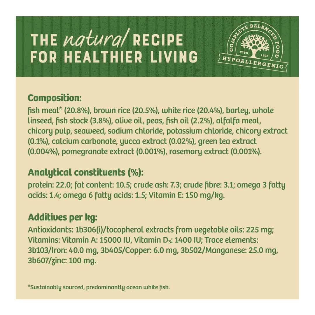 Fish meal (20.8%), brown rice (20.5%), white rice (20.4%), barley, whole linseed, fish stock (3.8%), olive oil, peas, fish oil (2.2%), alfalfa meal, chicory pulp, seaweed, sodium chloride, potassium chloride, chicory extract (0.1%), calcium carbonate, yucca extract, green tea extract, pomegranate extract, rosemary extract