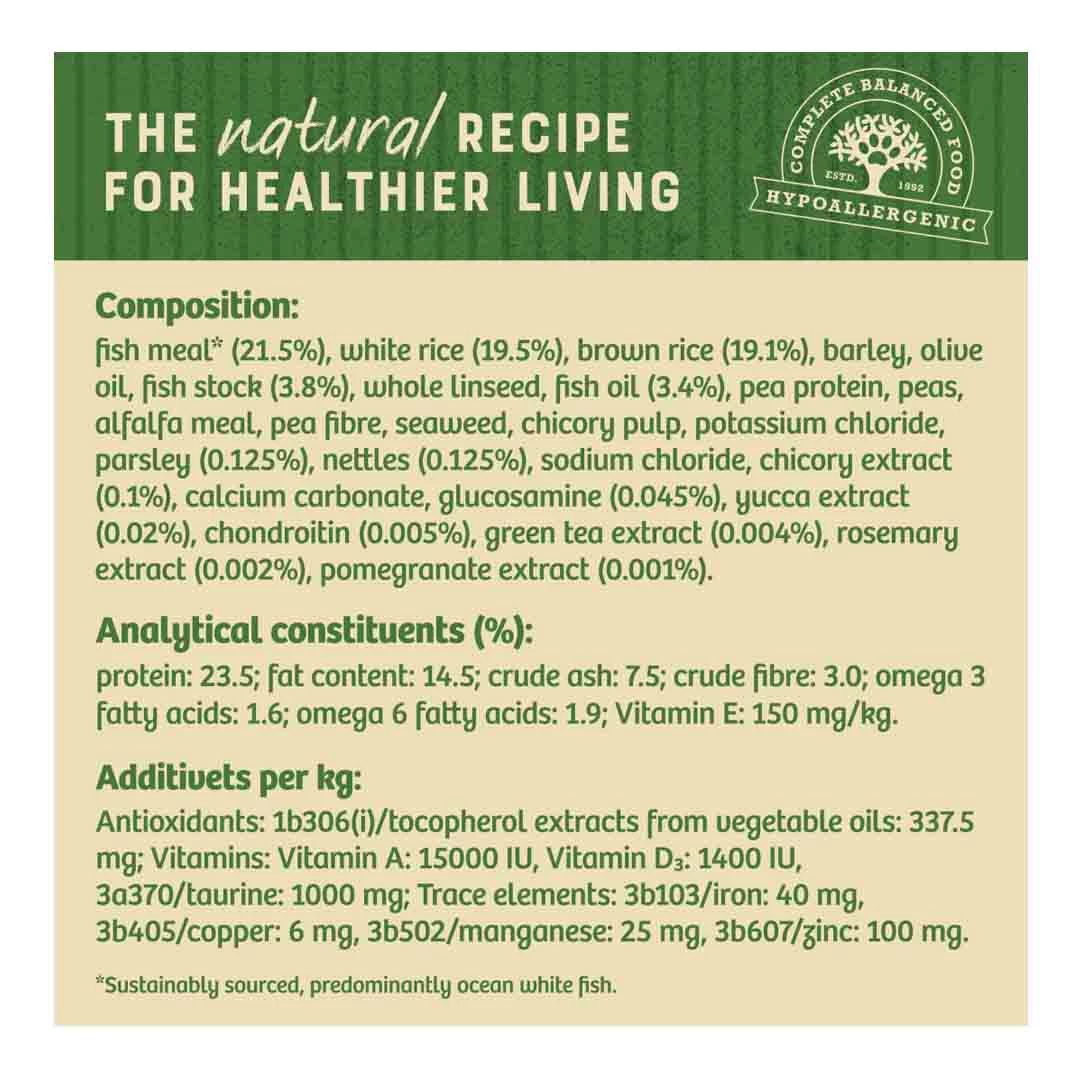Fish meal (21.5%), white rice (19.5%), brown rice (19.1%), barley, olive oil, fish stock (3.8%), whole linseed, fish oil (3.4%), pea protein, peas, alfalfa meal, pea fibre, seaweed, chicory pulp, potassium chloride, parsley (0.13%), nettles (0.13%), sodium chloride, chicory extract (0.1%), calcium carbonate, glucosamine (0.04%), yucca extract (0.2%), chondroitin, green tea extract, rosemary extract, pomegranate extract