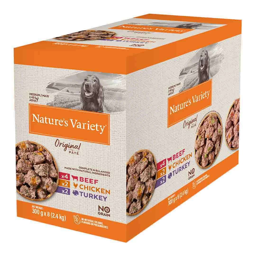This selection pack of Nature”s Variety Original Pâté contains 8 complete and balanced pouches of our high quality, nutritious wet dog food. Three different proteins to choose from will give your dog the tasty variety they need: