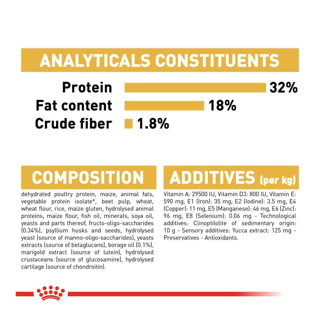 Poultry protein (dried), maize, animal fat, vegetable protein isolate, dried sugar beet pulp, wheat, wheat meal, rice, maize gluten meal, animal protein (hydrolysed), maize meal, fish oil, minerals, soya oil, yeast and derivatives thereof, fructooligosaccharides (0.34%), psyllium (husks and seeds), yeast hydrolysate (source of mannanoligosaccharides), yeast extract (source of beta-glucane), borage oil (0.1%), marigold meal (source of lutein), hydrolysate from crustaceans (source of glucosamine), hydrolysate from cartilage (source of chondroitin)