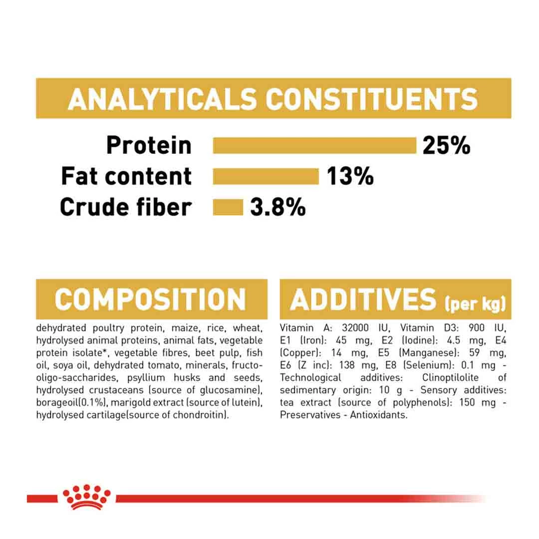 Dehydrated poultry protein, maize, rice, wheat, hydrolysed animal proteins, animal fats, vegetable protein isolate, vegetable fibres, beet pulp, fish oil, soya oil, dehydrated tomato, minerals, fructo-oligo-saccharides, psyllium husks and seeds, hydrolysed crustaceans, borage oil , marigold extract, hydrolysed cartilage