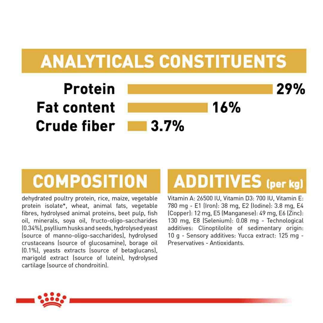dehydrated poultry protein, rice, maize, vegetable protein isolate, wheat, animal fats, vegetable fibres, hydrolysed animal proteins, beet pulp, fish oil, minerals, soya oil, fructo-oligo-saccharides (0.34%), psyllium husks and seeds, hydrolysed yeast (source of manno-oligo-saccharides), hydrolysed crustaceans (source of glucosamine), borage oil (0.1%), yeasts extracts (source of betaglucans), marigold extract (source of lutein), hydrolysed cartilage (source of chondroitin)