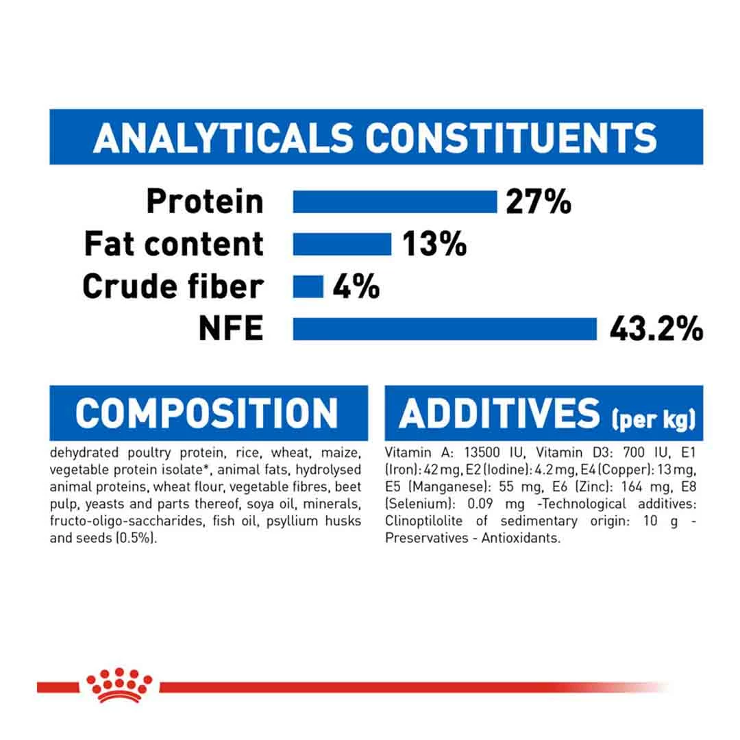 dehydrated poultry protein, rice, wheat, maize, vegetable protein isolate, animal fats, hydrolysed animal proteins, wheat flour, vegetable fibres, beet pulp, yeasts and parts thereof, soya oil, minerals, fructo-oligo-saccharides, fish oil, psyllium husks and seeds (0.5%)