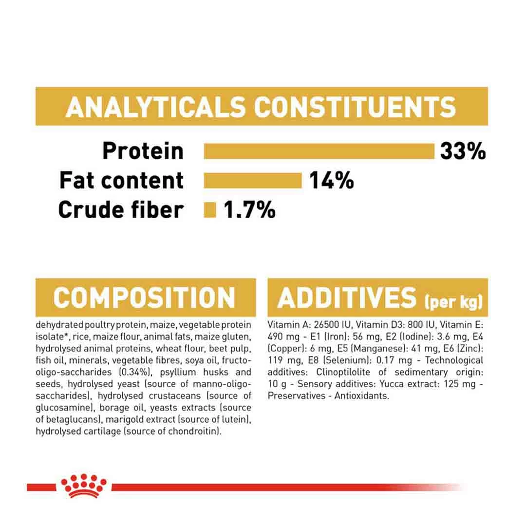 Rice, dehydrated poultry protein, maize, vegetable protein isolate, maize gluten, animal fats, hydrolysed animal proteins, minerals, beet pulp, fish oil, vegetable fibres, soya oil, fructo-oligo-saccharides, psyllium husks and seeds, hydrolysed yeast (source of mannooligo-saccharides), hydrolysed crustaceans (source of glucosamine), borage oil, marigold extract (source of lutein), hydrolysed cartilage (source of chondroitin)