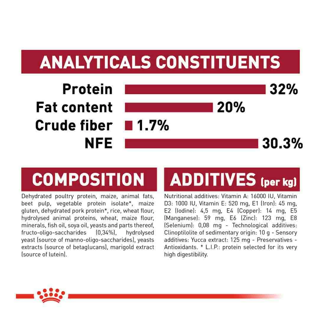 Poultry protein (dried), animal fat, maize, vegetable protein isolate, beet pulp, wheat flour, rice, animal protein (hydrolysed), wheat, maize meal, fish oil, yeast, soya oil, minerals, fructo-oligosaccharide (0.34%), yeast hydrolysate (source of manna-oligosaccharide), yeast extract (source of beta glucan), marigold meal (source of lutein)