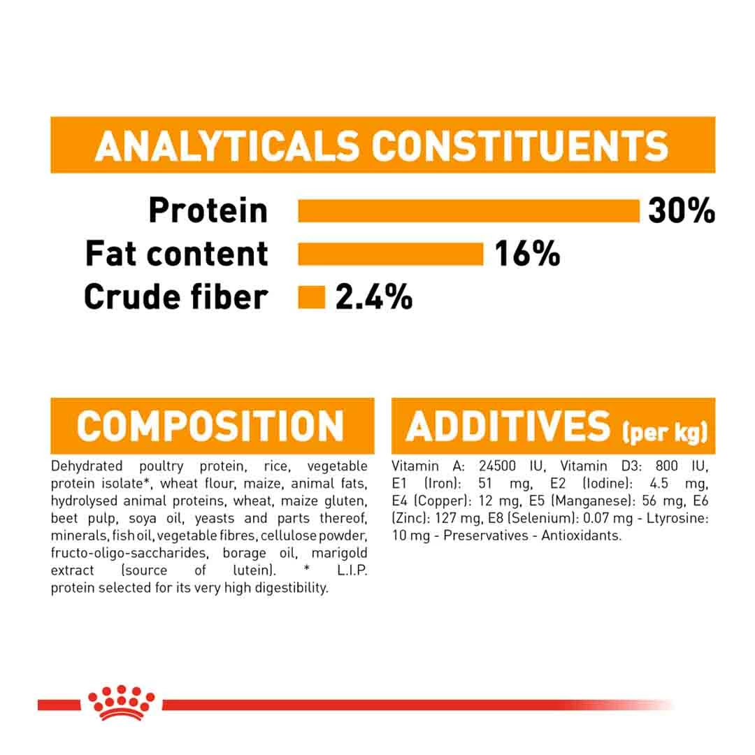 dehydrated poultry protein, rice, vegetable protein isolate, wheat flour, maize, animal fats, hydrolysed animal proteins, wheat, maize gluten, beet pulp, soya oil, yeasts and parts thereof, minerals, fish oil, vegetable fibres, cellulose powder, fructo-oligo-saccharides, borage oil, marigold extract (source of lutein)