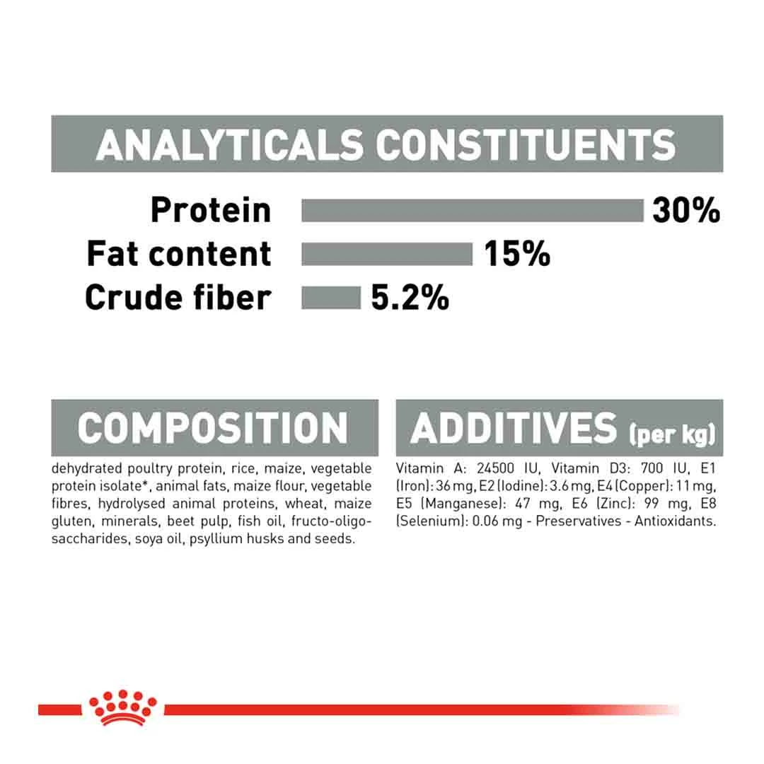 Dehydrated poultry protein, rice, maize, vegetable protein isolate, animal fats, maize flour, vegetable fibres, hydrolysed animal proteins, wheat, maize gluten, minerals, beet pulp, fish oil, fructo-oligo-saccharides, soya oil, psyllium husks and seeds
