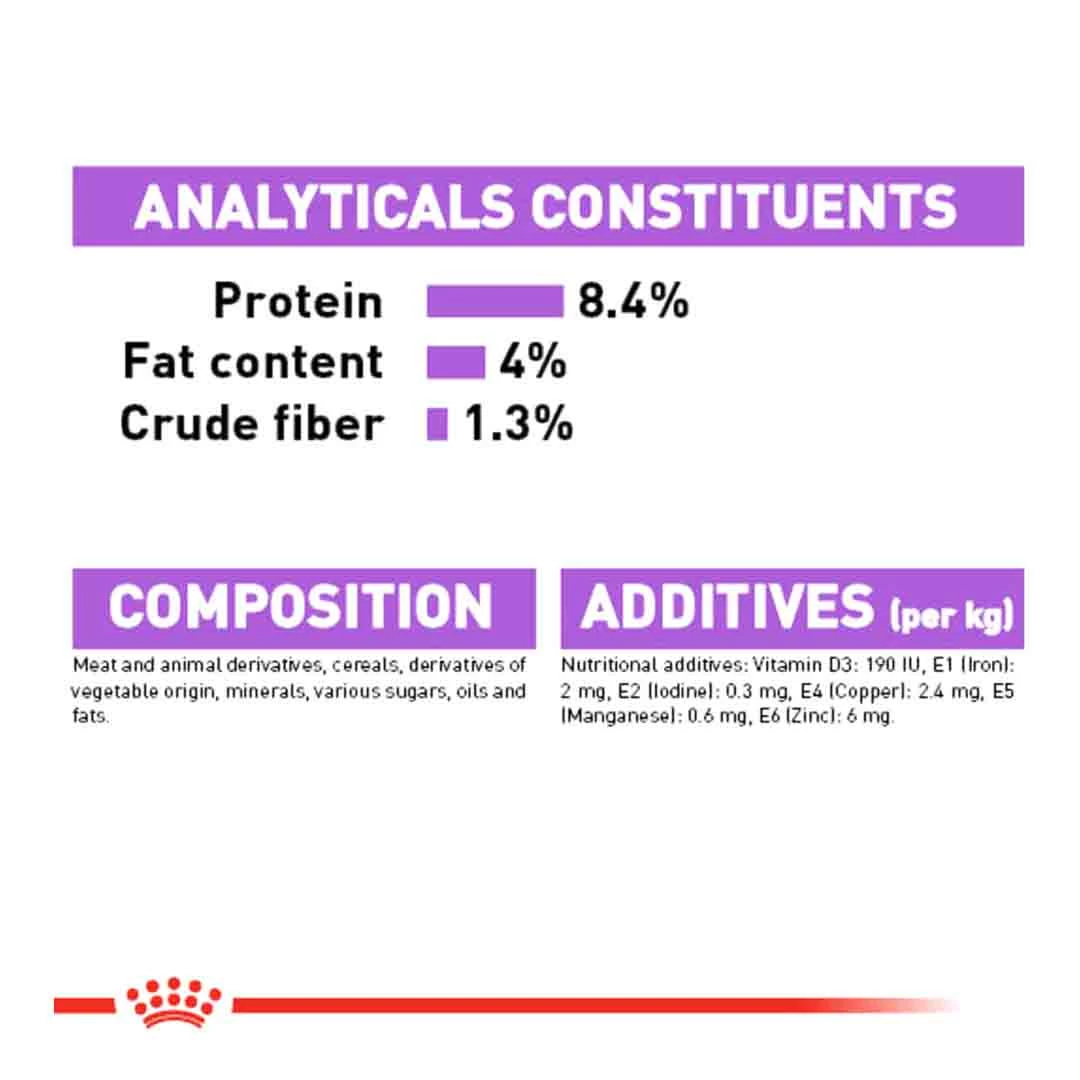 Crude ash (1.5%), Crude fibre (1.3%), Crude oil fats (4%), Moisture, Protein (8.4%)